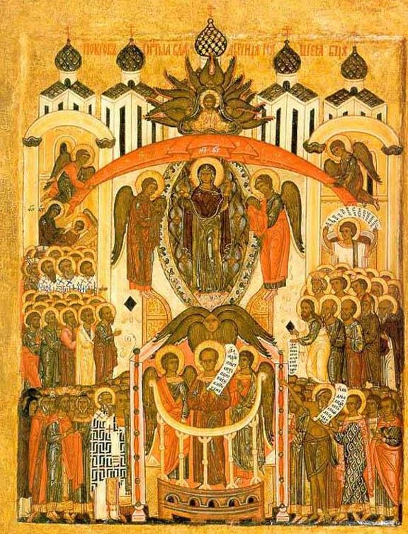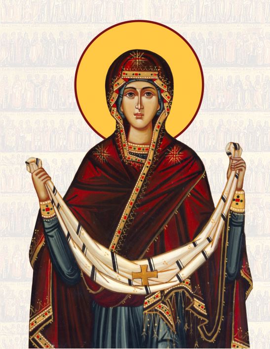 Împărătesei celei alese mai înainte de veci, împărătesei celei mai înalte decât toată făptura cerului și a pământului, care a venit oarecând la rugăciune în biserica cea din Vlaherne și se ruga pentru cei din întuneric, acesteia și noi, cu credință și cu umilință, îi serbăm Acoperământul ei cel luminos.