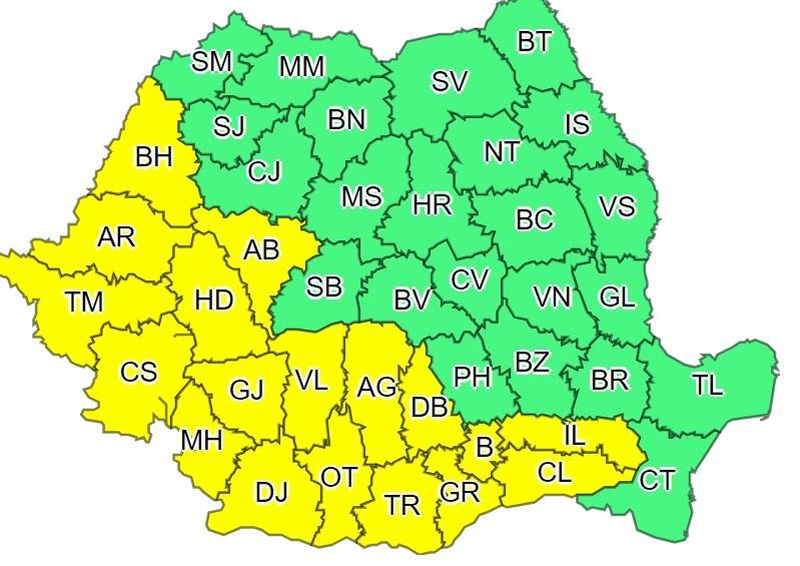 Administrația Națională de Meteorologie a emis, miercuri, un nou Cod galben, valabil pentru 18 județe, care intră în vigoare de la ora 15.00.