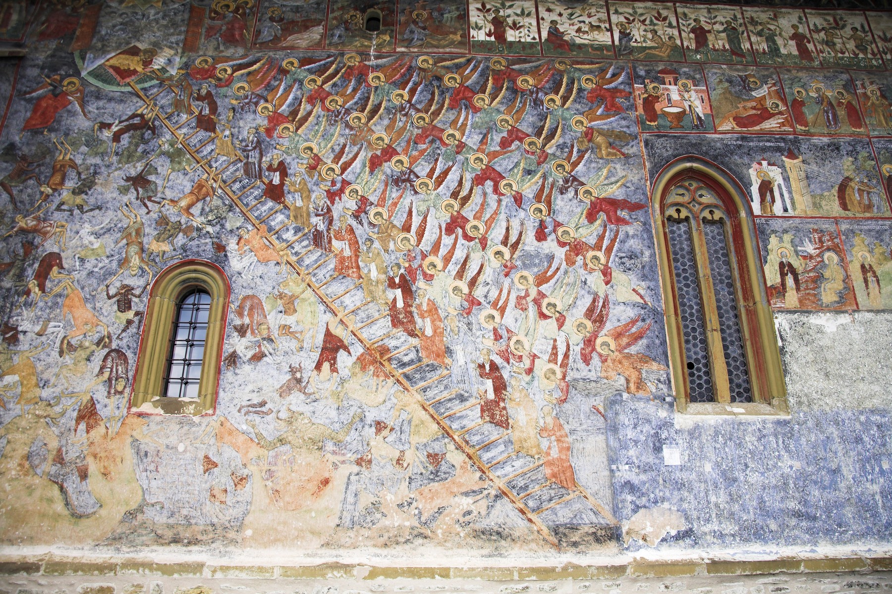 Una dintre cele mai remarcabile caracteristici ale Mănăstirii Sucevița este ciclul său de fresce, care se remarcă prin complexitatea și originalitatea lor. În special, „Judecății de Apoi” din exteriorul bisericii este o scenă rară. Fresca înfățișează judecata finală și este adesea privită ca o reprezentare a viziunii religioase complexe a vremii, cu o detaliere extraordinară a scenelor și personajelor.