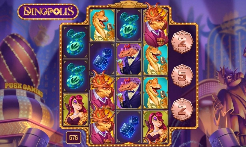 Până și jetoanele sunt personalizate, având în centru o urmă de picior de dinozaur. Astfel, avem personaje care joacă cărți, care au în „mâini” teancuri de bani, care sorb dintr-un cocktail sau care cântă la un microfon ca în filme de epocă.Simbolul Wild are atașat un factor de multiplicare (x2 sau x3) și poate substitui orice simbol, mai puțin mâna cu cărți de joc albastre, care este Scatter. Minim trei simboluri Scatter oprite pe ecran declanșează funcția „Dino Coins”, în timpul căreia pe role pot ateriza monede cu valori diferite, de la 5 la 1000 (reprezentând factor de multiplicare pentru miză).