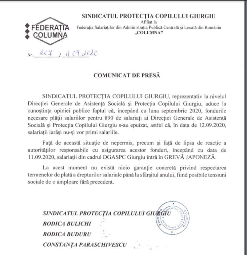 890 de salariați din cadrul Direcției Generale de Asistență Socială și Protecția Copilului Giurgiu nu și-au primit salariile. Conform Sindicatului pentru Protecția Copilului Giurgiu, începând cu luna septembrie 2020, fondurile necesare plății salariilor pentru 890 de salariați ai Direcției Generale de Asistență Socială și Protecția Copilului Giurgiu s-au epuizat, astfel că giurgiuvenii nu și-au primit salariile pe data de 12 septembrie.