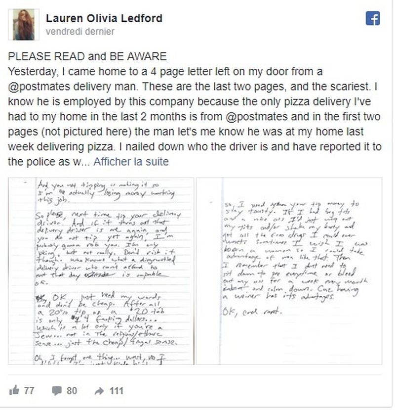 Potrivit unei postari pe pagina ei de Facebook, Lauren a crezut ca pretul achitat la livrare acopera si costurile transportului, inclusiv bacsisul.