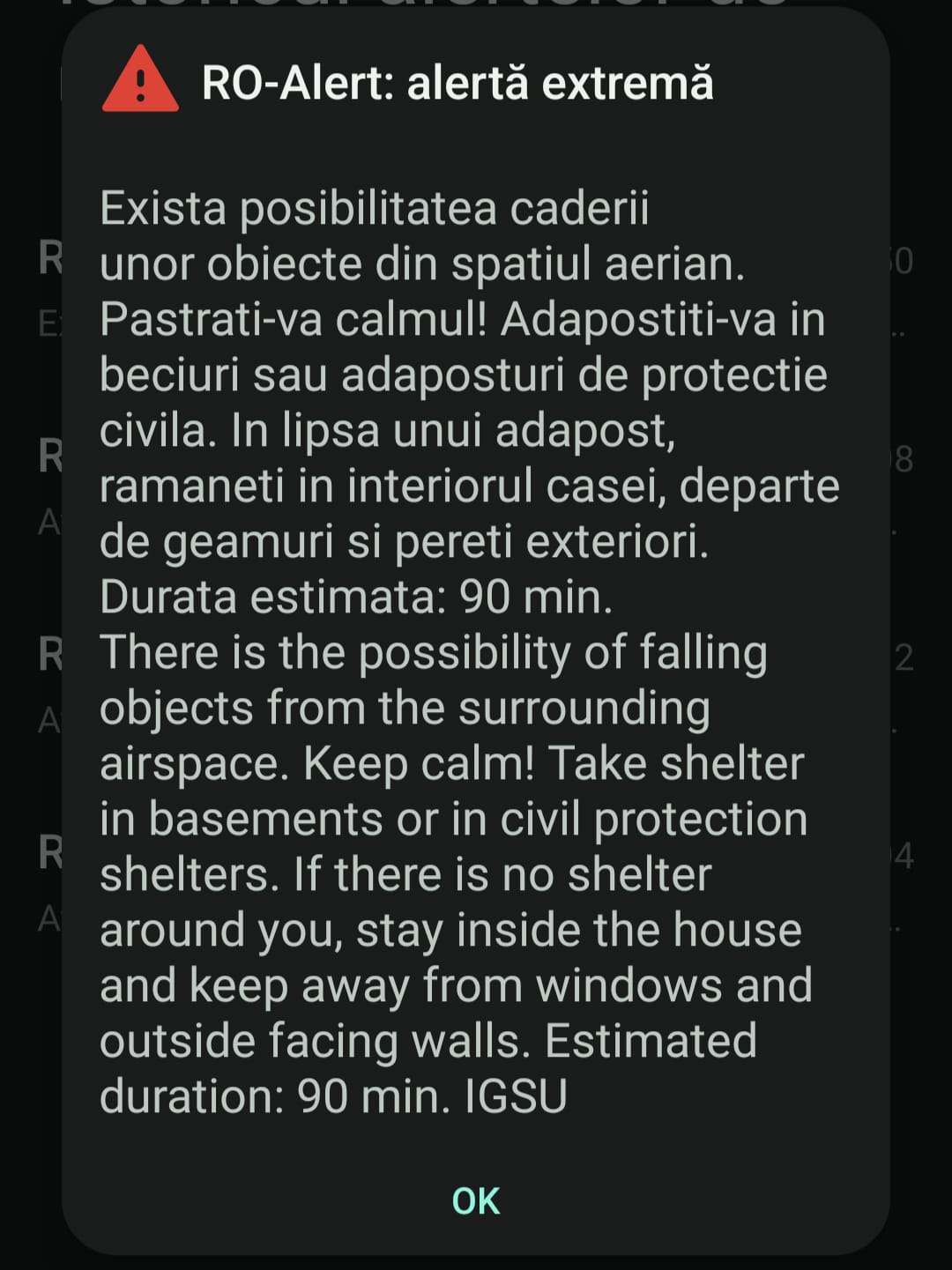 ”Există posibilitatea căderii unor obiecte din spațiul aerian. Păstrați-vă calmul! Adăpostiți-vă în beciuri sau adăposturi de protecție civilă. În lipsa unui adăpost, rămâneți în interiorul casei, departe de geamuri şi pereţi exteriori”, arată mesajul transmis de ISU populaţiei.