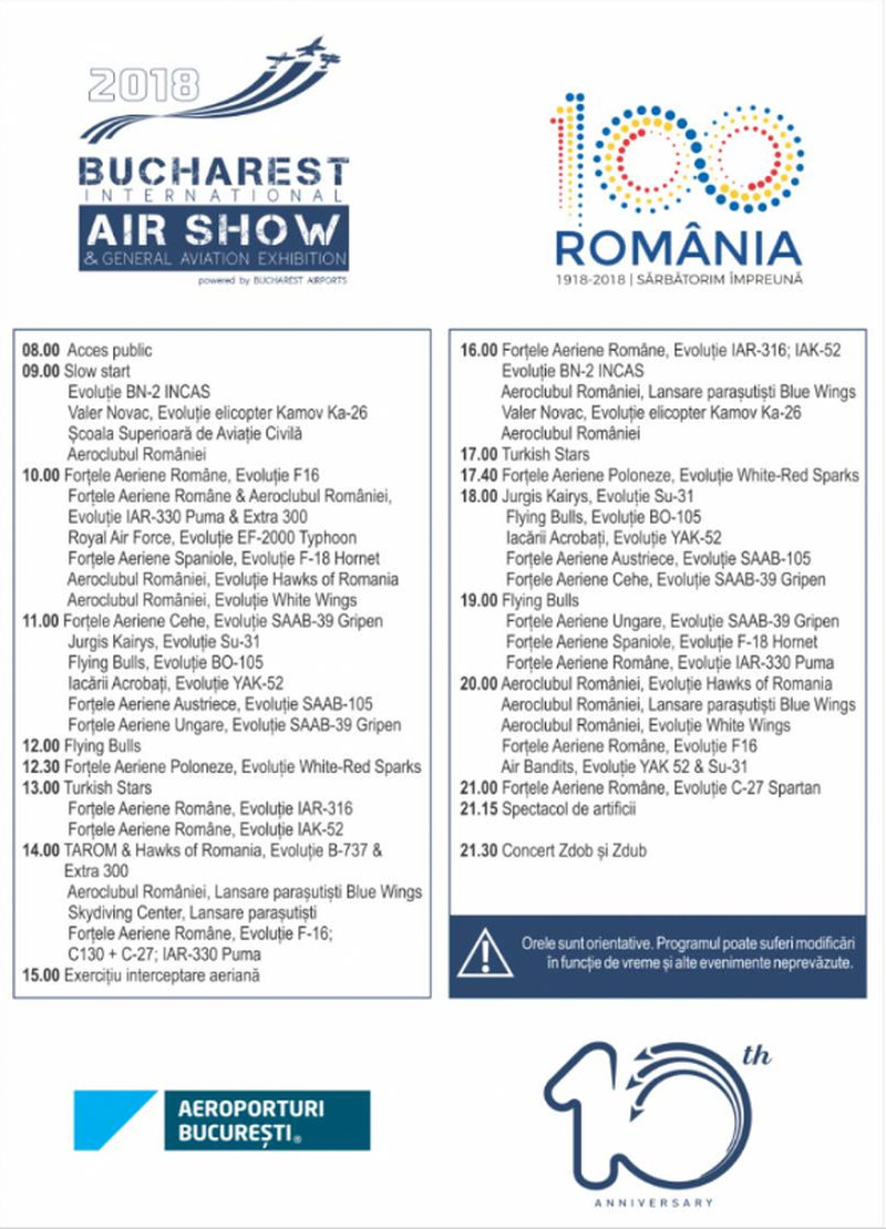 Startul oficial al spectacolului a fost dat la 10:00 de Fortele Aeriene Romane. Cinci aeronave F-16 vor survola Aeroportul Baneasa.