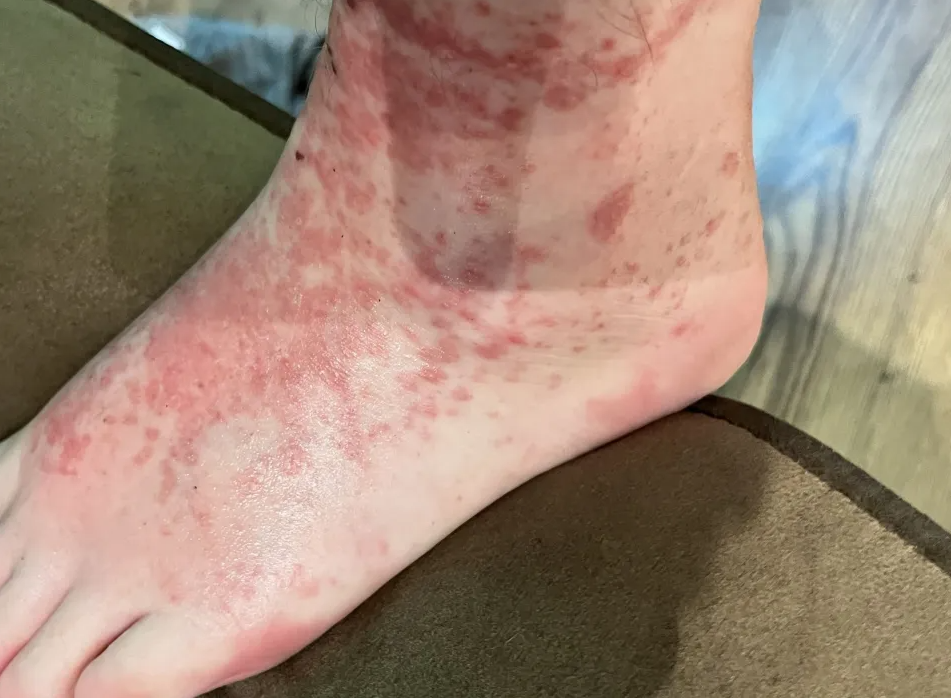 „Când m-am trezit dimineața după ce am purtat pantofii, am observat o mică erupție roșie pe picior. Uneori am eczemă pe față, așa că am crezut că acesta este același lucru. Mi-am pus doar niște cremă pentru eczemă pe picior. Dar în următoarele două zile erupția s-a agravat. Am luat antihistaminice și apoi am început să observ petele roșii care îmi ridică picioarele. M-am speriat că locuința mea ar putea fi plină de scabie, dar, din fericire, nimeni din familia mea nu a apărut cu erupții cutanate”,