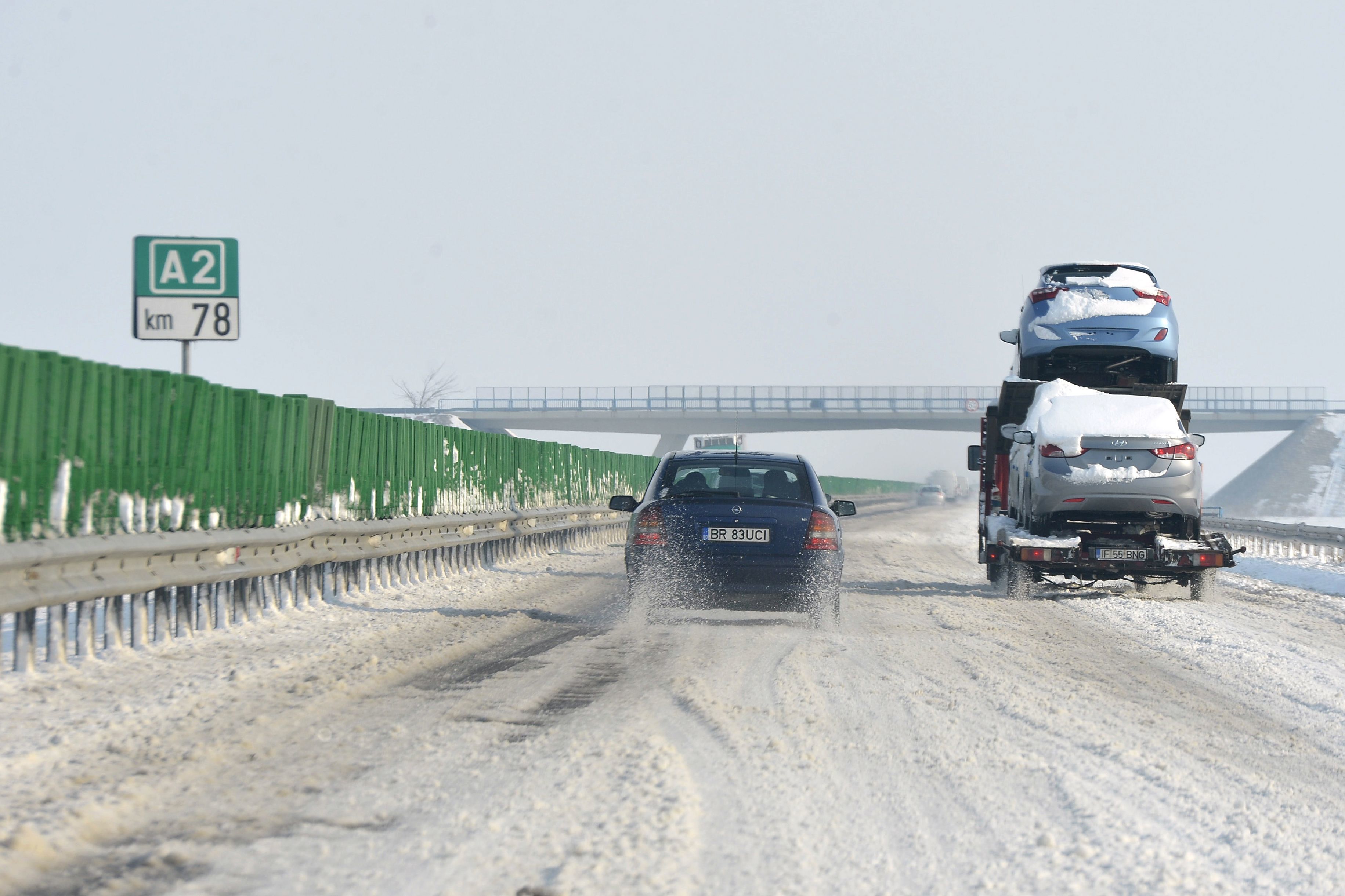 Circulatia rutiera se desfasoara in conditii de iarna, sambata dimineata, pe autostrada A2 Bucuresti - Constanta, tronsonul Medgidia - Murfatlar - Constanta, si pe autostrada A4 Ovidiu - Agigea, unde ninge si s-a depus un strat subtire de zapada, anunta centrul Infotrafic al Politiei Romane.