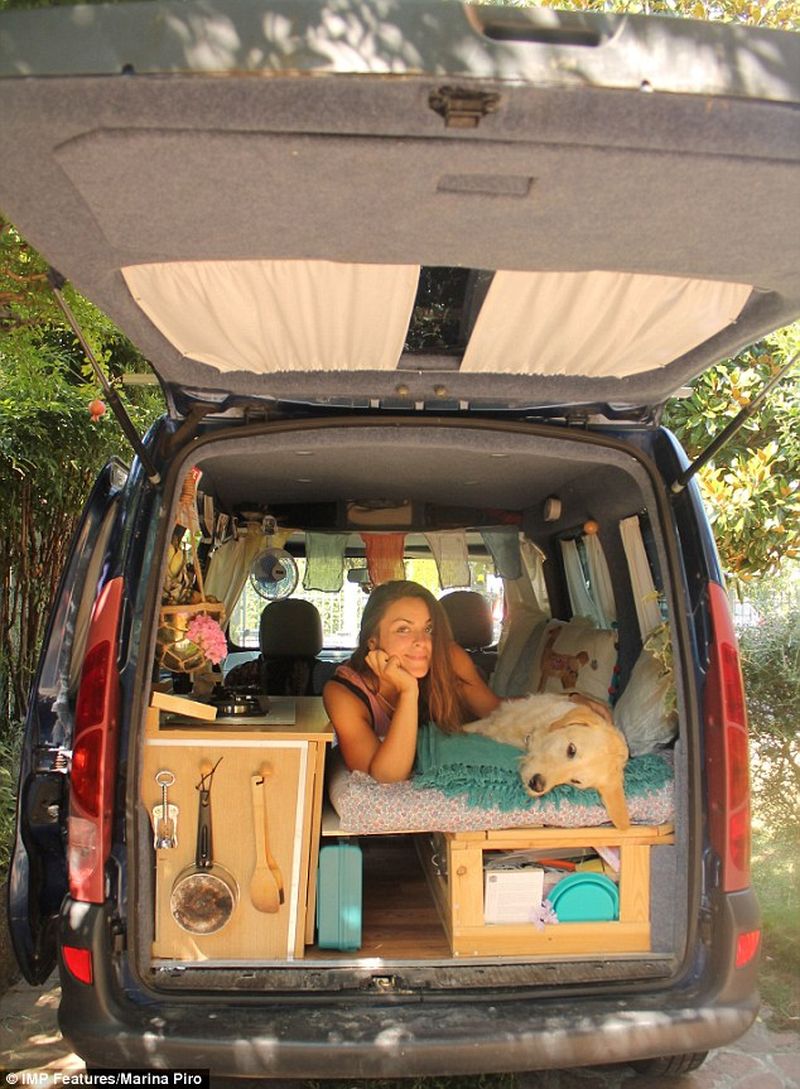 O femeie a renuntat la slujba ei de birou si a pornit intr-o aventura alaturi de cainele ei. Tanara italianca de 25 de ani locuieste acum intr-o masina pe care a transformat-o chiar ea intr-o casa pe roti, cu 500 de dolari. Are pat, perdele, lumini si chiar chicineta.