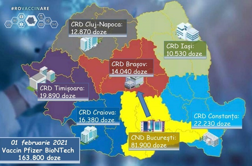 Astfel, procesul de vaccinare continuă atât în centrele din Bucureşti, cât şi din ţară, fiind distribuite 163.800 doze Pfizer BioNTech, după cum urmează: Centrul Naţional de Distribuţie Bucureşti: 81.900 doze; Centrul Regional de Distribuţie Braşov: 14.040 doze (dozele vor fi distribuite din totalul dozelor de vaccin alocate Centrului Naţional de Distribuţie Bucureşti), iar transportul va fi executat cu o autospecială a MApN, însoţită de autospeciale ale jandarmeriei şi poliţiei, cu respectarea lanţului de frig; -Centrul