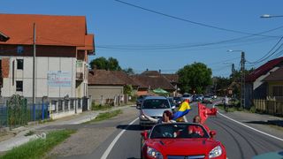 Sa se fii demodat sampania?! Ceva mai indrazneata decat Papa, prima doamna a orasului a ales o decapotabila rosie cu "trena" de claxoane!! E atat de bucuroasa ca nici nu se mai gandeste la centura. Proaspata primarita flutura temeinic din maini, in timp ce oamenii se strang pe la porti, ca la urs: doar soarele, ivit parca la semn, o mai impiedica pe doamna edil sa-si faca intrarea pe strada ca