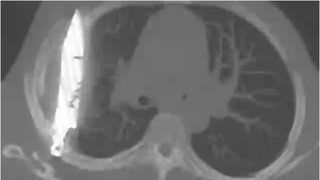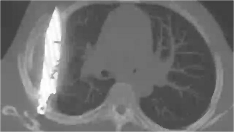 În urma discuțiilor cu pacientul, s-a aflat că acesta fusese înjunghiat în urmă cu 8 ani, iar lama metalică intrase în corp prin umărul drept.