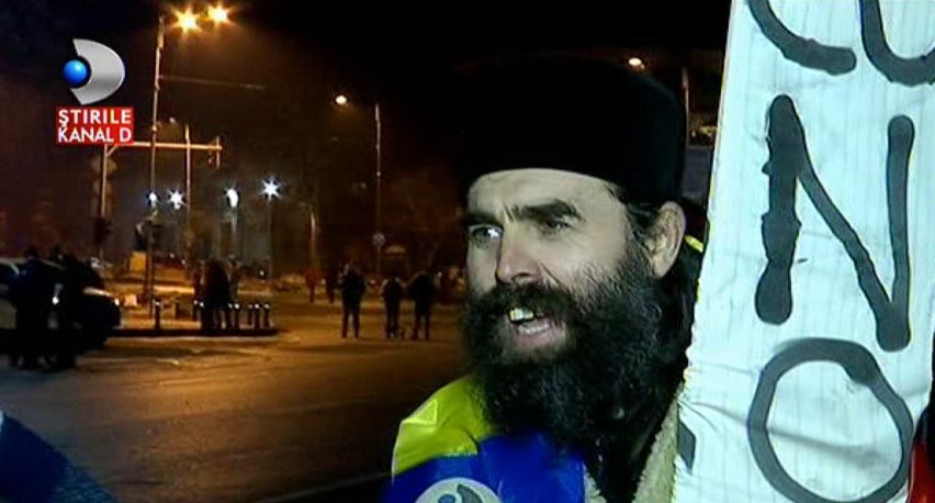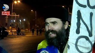 Crucea pe care multi o considera mult prea grea de dus pentru poporul roman e purtata pe umeri de acest calugar. Invelit in tricolor, barbatul nu se teme sa-si strige convingerile.