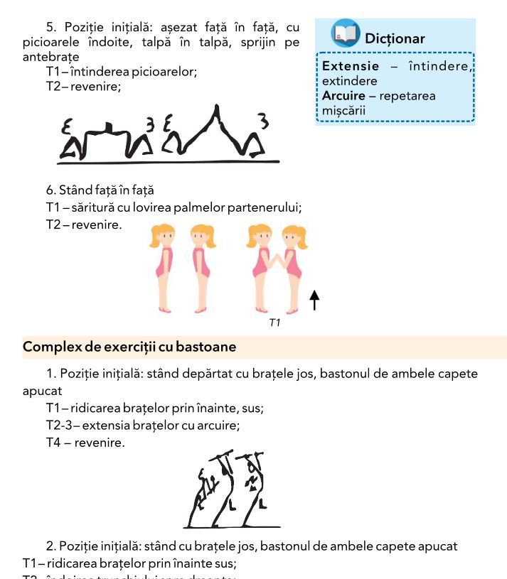 Manualul de Educatie Fizica si Sport de clasa a cincea, realizat sub egida Ministerului Educatiei Nationale la Editura Didactica si Pedagogica, ar trebui sa ofere elevilor notiuni teoretice despre miscare si exercitii fizice. In loc de acest lucru, acestia primesc o serie de schite care aduc mai mult cu picturile rupestre, de neinteles pentru majoritatea oamenilor normali. Nici macar cu ajutorul explicatiilor foto, elevii nu ar putea intelege ce incearca autorii manualului sa explice.