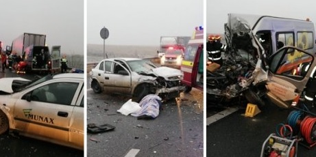 ”În accident au fost implicate un autotren cu o persoană, un autoturism cu 2 persoane şi un microbuz cu 7 persoane. La faţa locului s-au deplasat o autospecială de descarcerare grea, 2 autospeciale de stingere, 3 echipaje SMURD, o autospecială de transport personal şi victime multiple, 17 pompieri, 2 echipaje SAJ”, a transmis ISU Timiş.