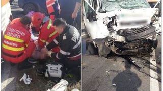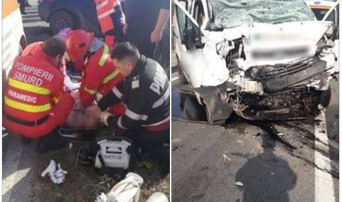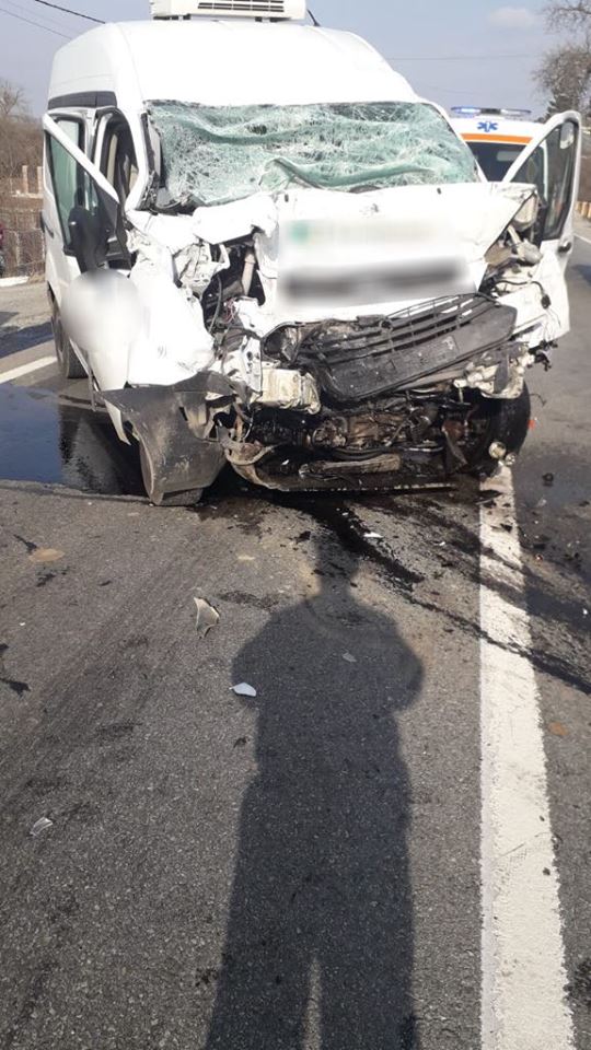 Impactul a fost atat de puternic, incat intreaga parte din fata a autoutilitarei, dar si usile au fost complet distruse. La fata locului a intervenit o ambulanta.