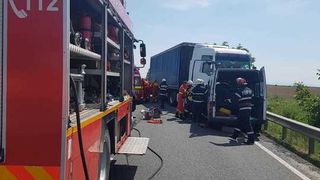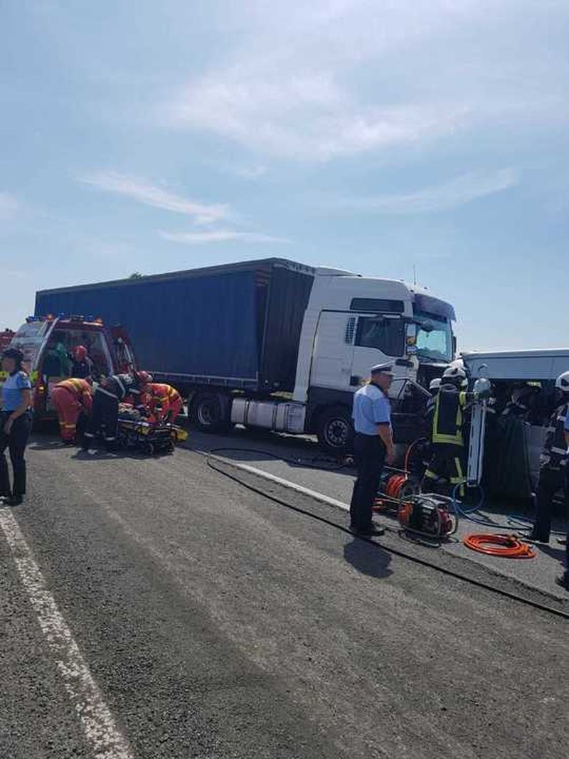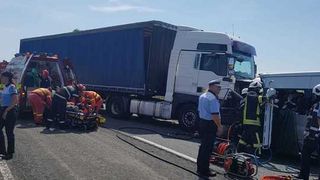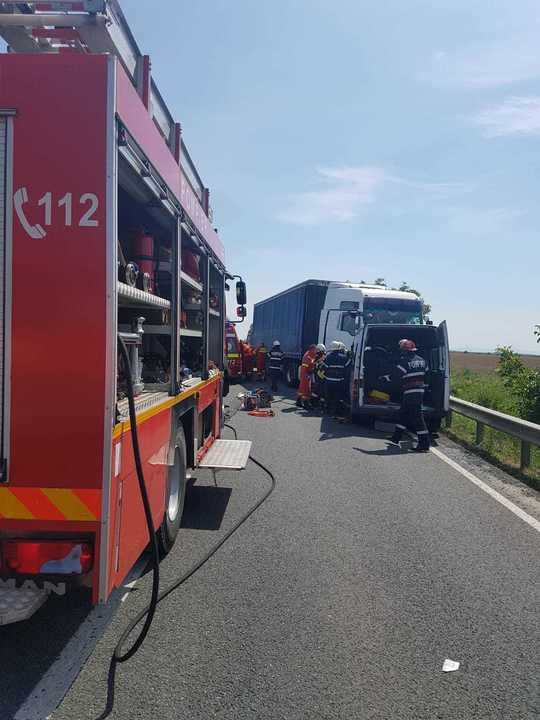 Astfel, camionul s-a ciocnit cu un microbuz care circula regulamentar din sens opus. De asemenea, în accident a fost implicat şi un autoturism, care circula în spatele microbuzului şi care a ajuns pe acostament după ce şoferul a încercat să evite impactul.
