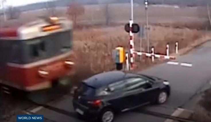 Imaginile au fost surprinse la o trecere la nivel cu calea ferata, in Polonia. Soferul autoturismului nu a oprit la bariera si a trecut peste calea ferata. Exact in acel moment a trecut si trenul.