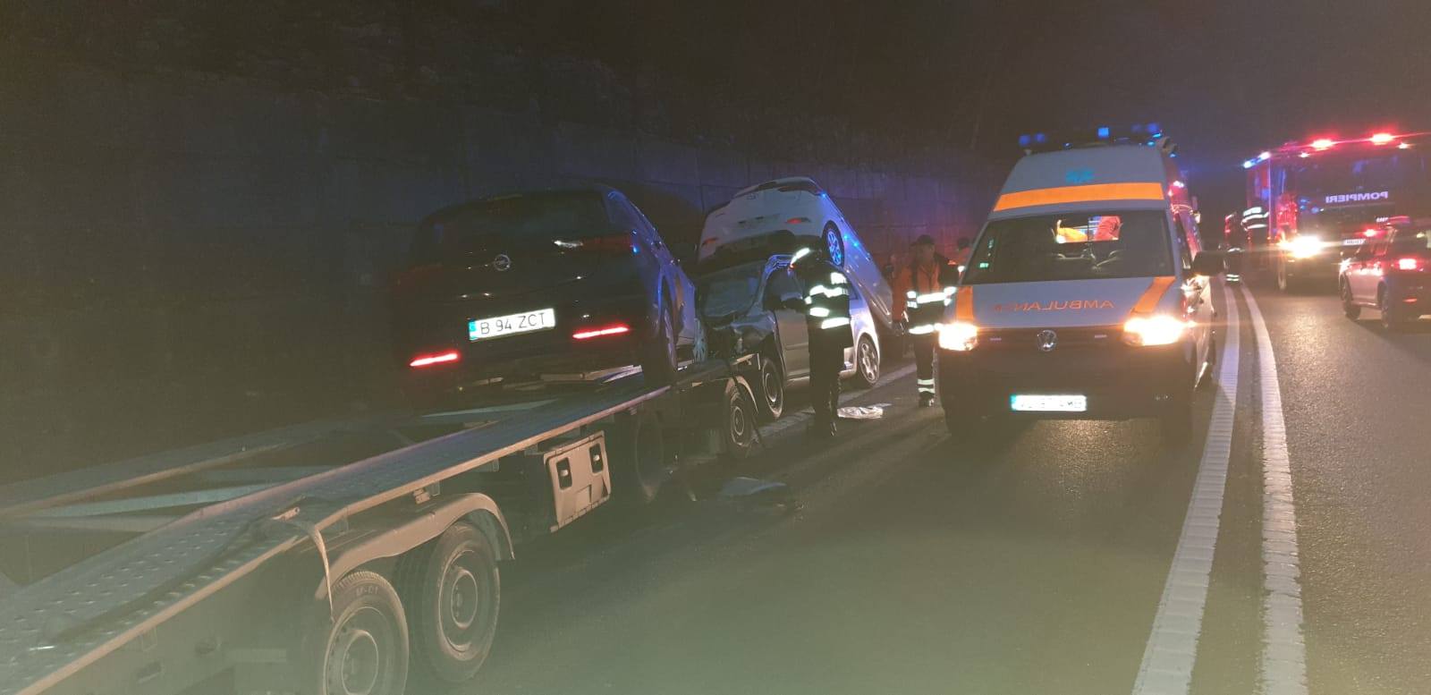 Un accident de proporții a avut loc pe DN 7 - Valea Oltului, între localitățile Călimanesti și Brezoi, după ce o platformă încărcată cu mașini s-a desprins si a lovit un autoturism.