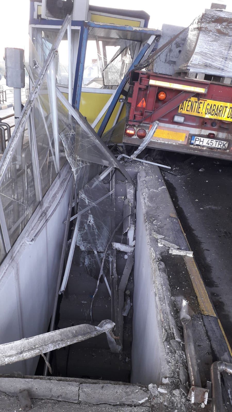 O cabină de la staţia de taxare de la Feteşti, camere video de supraveghere şi parapetul de protecţie au fost distruse, marţi dimineaţă, de un transport agabaritic. În urma incidentului nu au existat persoane rănite.