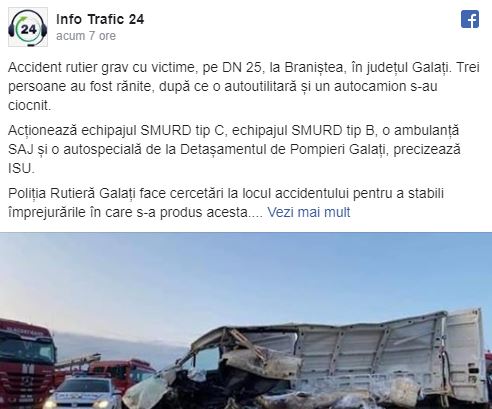 La faţa locului au intervenit echipajul SMURD tip C, echipajul SMURD tip B, o ambulanță SAJ și o autospecială de la Detașamentul de Pompieri Galați, precizează ISU.