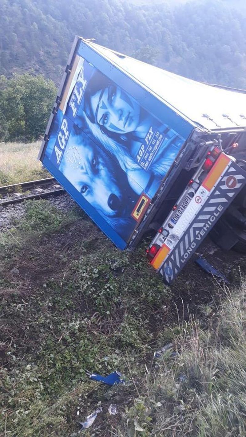 Accident grav in Caineni, din judetul Valcea! Un TIR s-a rasturnat pe sinele de cale ferata.