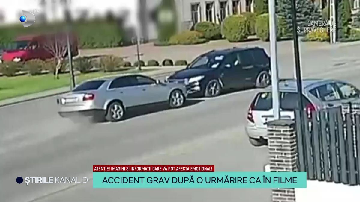 „Urmărire ca în filme în județul Suceava, după ce un șofer de 22 de ani, beat și fără permis, a încercat să scape de un echipaj de poliție. După o cursă nebună, care s-a întins pe cinci kilometri, a izbit în plin o mașină care circula regulamentar. Atenție, urmează imagini cu un puternic impact emoțional!