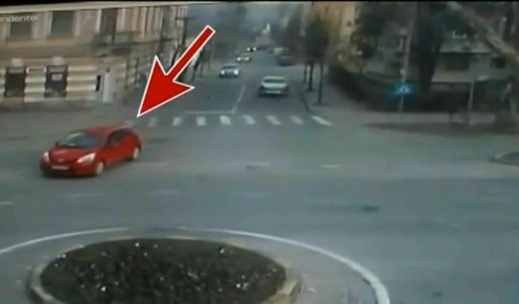Sa derulam faza si s-o privim cu atentie din alt unghi: agentul de politie, care ar fi la volanul masinii, pare ca schimba brusc benzile. Trece de pe a doua pe prima, chiar inainte sa intre in sens. In fata manevrei neasteptate si in viteza, femeia de la volanul masinii rosii- in care se afla si un copil de 4 ani- incremeste!
