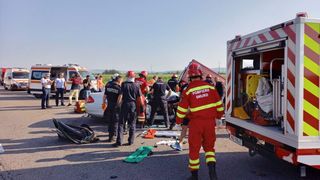 Se pare că un autoturism marca Mercedes s-a ciocnit frontal cu un microbuz în care se aflau mai multe persoane. Impactul a fost atât de puternic încât toţi oamenii aflaţi în cele două maşini au rămas încarceraţi. În autoturism, pe lângă şofer, se află şi doi copii, pe bancheta din spate, găsiţi inconştienţi. De asemenea, în microbuz, oamenii au rămas blocaţi, toţi fiind grav răniţi şi inconştienţi.