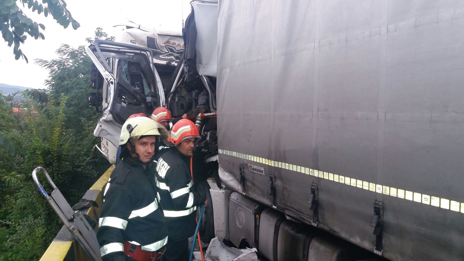 Doua TIR-uri s-au ciocnit frontal, miercuri dupa-amiaza, pe DN 7, in zona comunei Bujoreni din judetul Valcea, soferii fiind incarcerati. Traficul este blocat complet in urma accidentului.