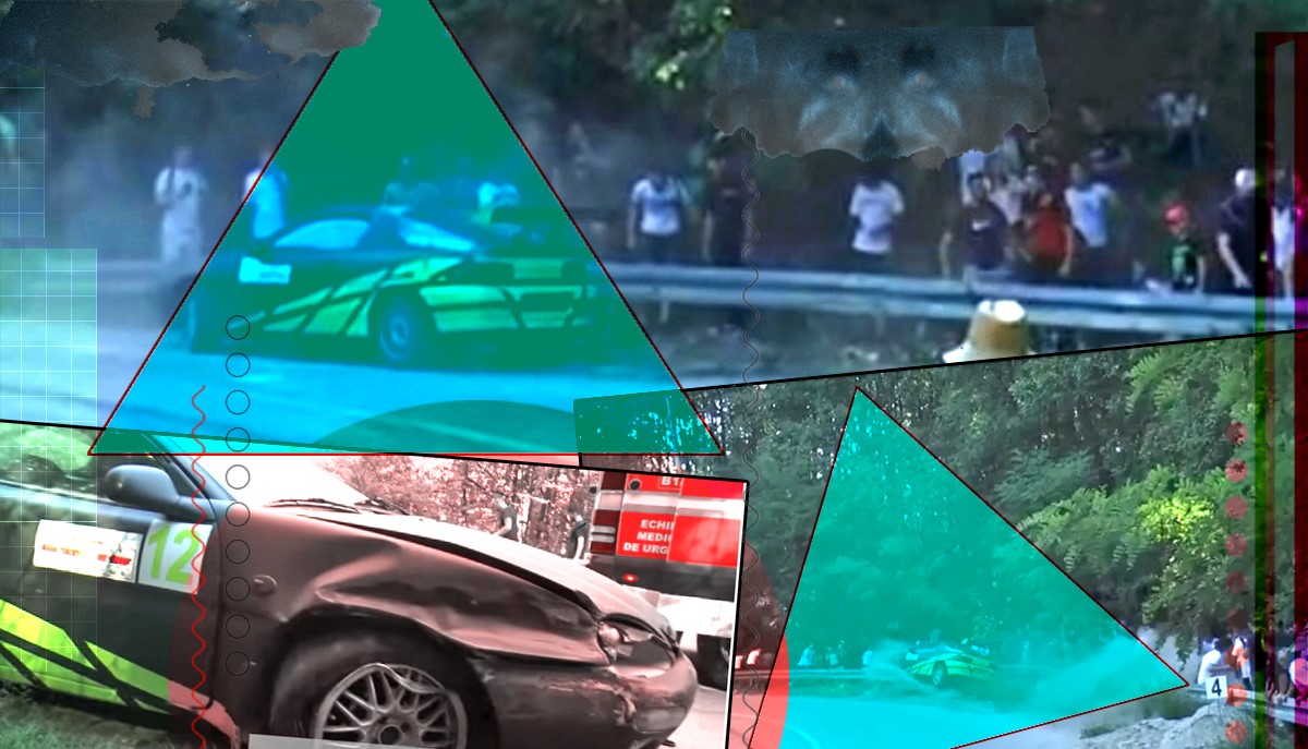 În imagini se vede cum pilotul a pierdut controlul volanului într-o curbă și a rupt bara de protecție aflată pe marginea drumului, unde se aflau mai mulți oameni care priveau competiția.