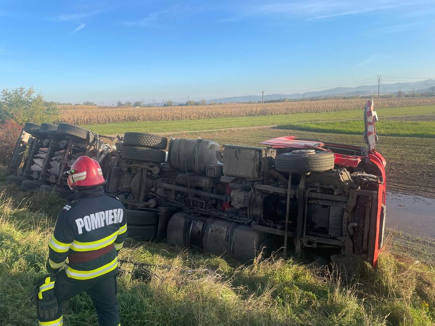 O cisternă încărcată cu vin s-a răsturnat, după o coliziune cu un utilaj agricol