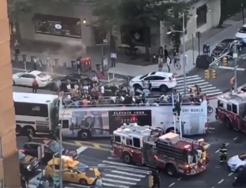 Un autobuz de turism cu două etaje a trecut pe roșu și s-a ciocnit cu un alt autobuz de transport local din cartierul Manhattan, New York.
