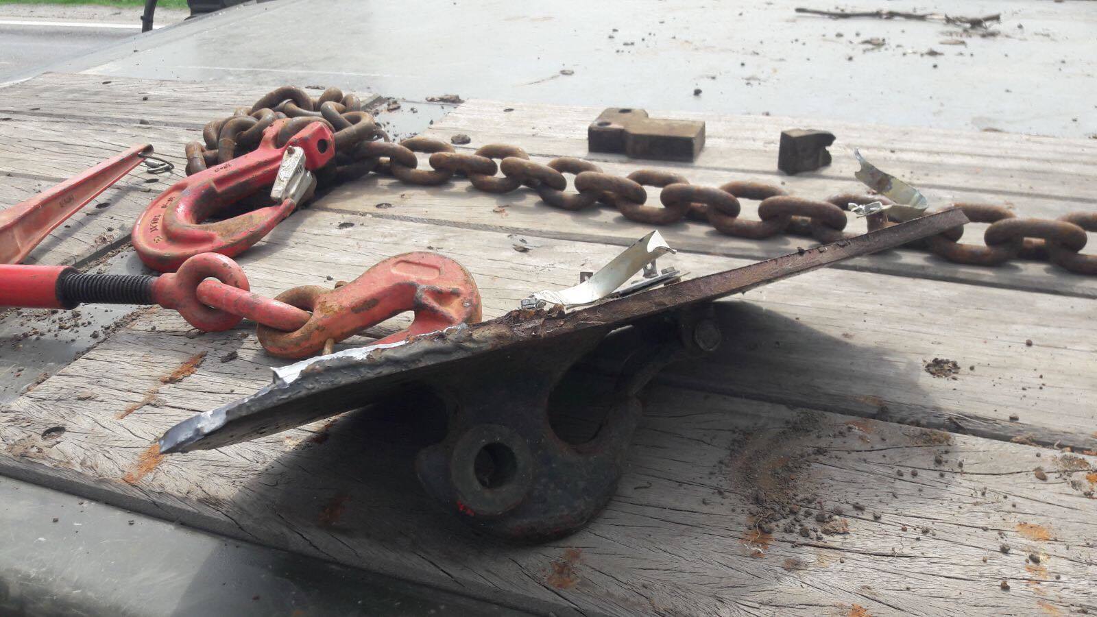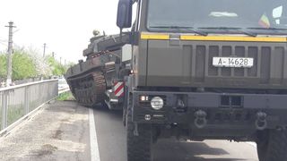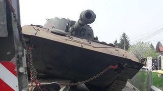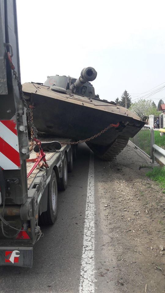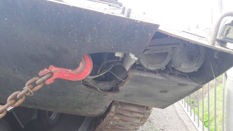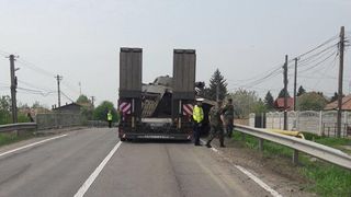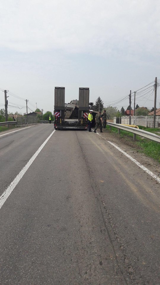 Un tanc ce se afla pe un trailer de armata s-a desprins din locul special amenajat, asta din cauza slabei asigurari a sistemului de fixare si a alunecat usor spre carosabil, o parte ramanand in continuare pe trailer.