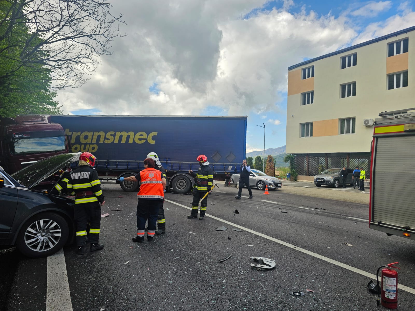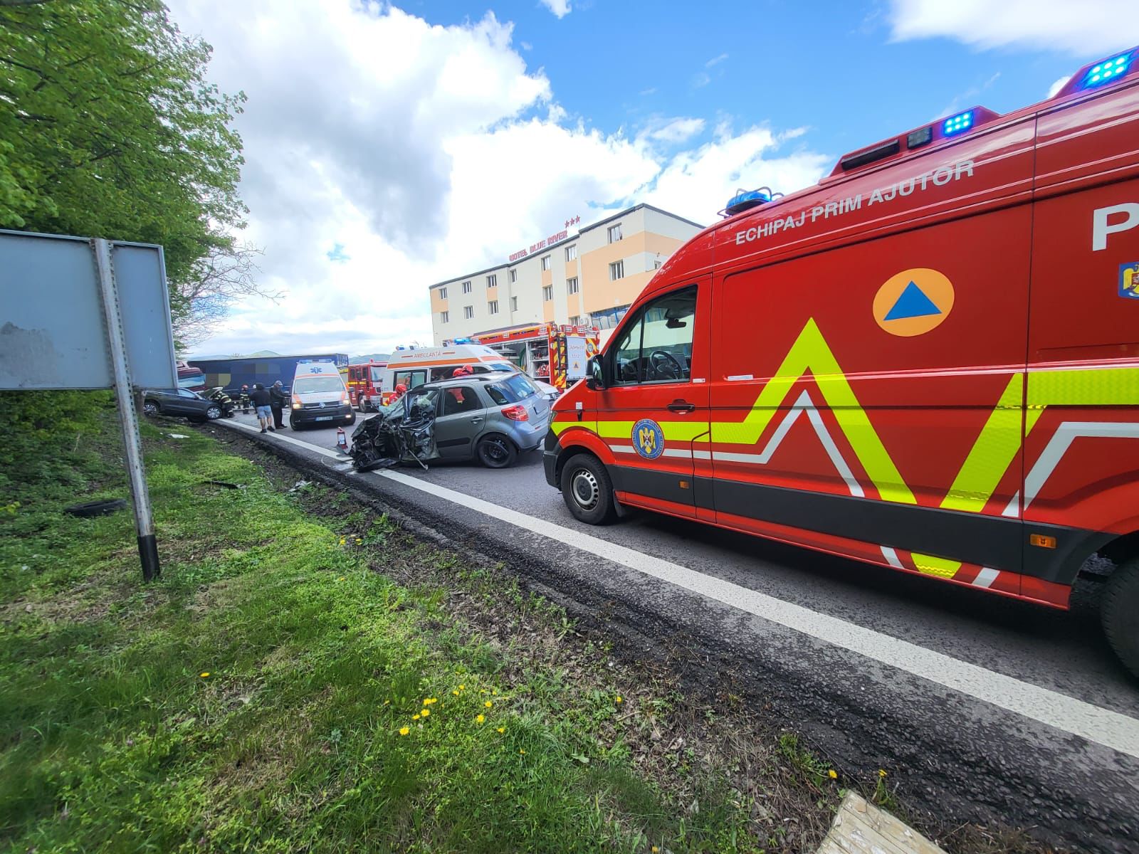 Din primele verificări efectuate la fața locului, a reieșit că în eveniment sunt implicate două autoturisme și un autocamion, cauza probabilă fiind pătrunderea pe sensul opus de mers.