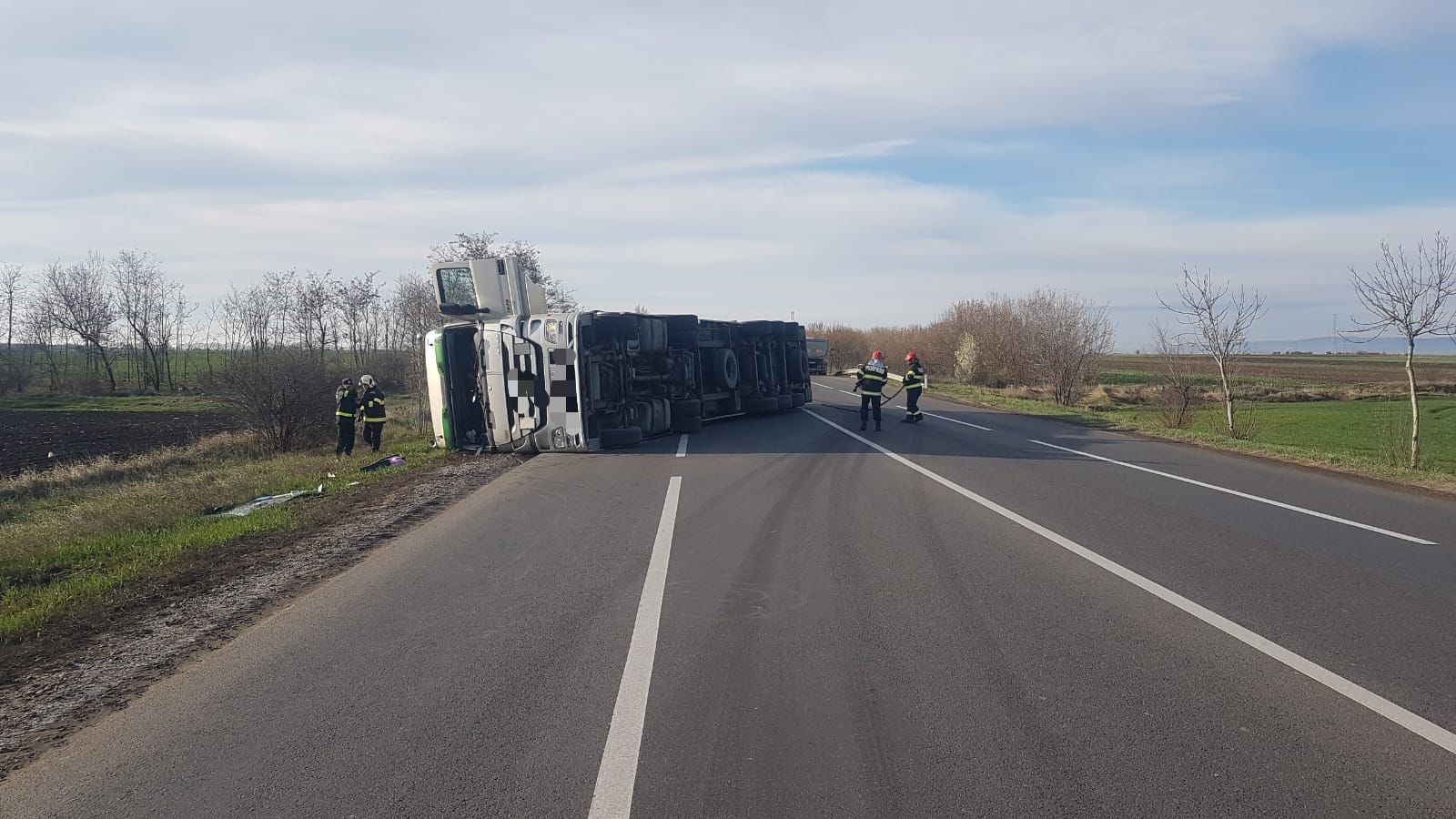 Autocisterna cu apă a ajuns la fața locului, iar la nici 200 de metri distanță de accident, aceasta a derapat și a căzut și ea pe șosea.
