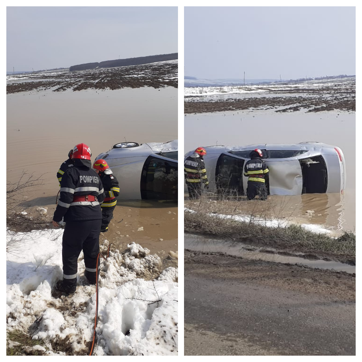 Un autoturism, în care se aflau două persoane, s-a răsturnat în afara părții carosabile, într-o baltă formată ca urmare a topirii zăpezii.