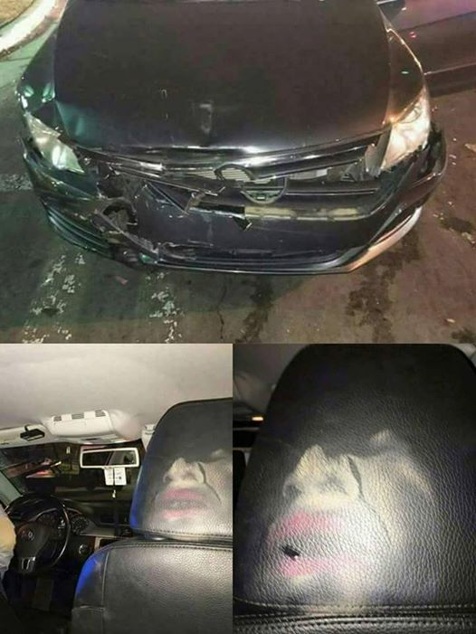 Imaginile au fost distribuite intens pe reteaua de socializare din pricina faptului ca in urma coliziunii au aparut pe scaunul din fata al masinii urme de ruj si fard.