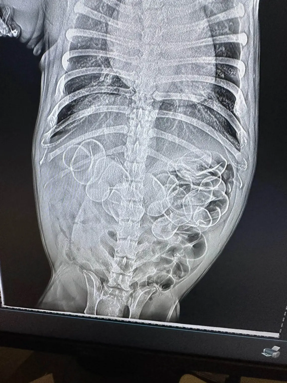 Având dubii că animalul ei de companie ar putea fi vinovat de dispariția raței, l-a dus imediat la veterinar. A fost șocată când medicii au realizat o radiografie a stomacului câinelui, localizând cel puțin cinci dintre jucării în imagine.