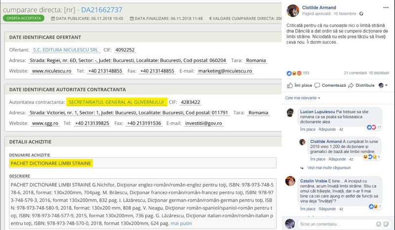 Informaţia privind achiziţiile Secretariatului General al Guvernului a venit de la Clotilde Armand, politiciana de la USR, publicând pe pagina sa de socializare şi un document care confirmă achiziţiile. Este vorba despre un ”pachet dicţionare limbi străine” care conţine dicţionar englez -român/român -englez pentru toţi, dicţionar francez-român/român -francez pentru toţi, dicţionar german-român/român-german pentru toţi, dicţionar român -spaniol/spaniol -român pentru toţi şi dicţionar român-italian/italian-român pentru toţi.