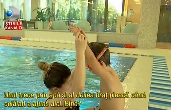 Alex, in varsta de 7 ani, si Hermina, o mica sirena in varsta de 6 ani, s-au obisnuit ca in vacanta sa-si reverse energia si pofta de miscare...in bazin. Au acelasi instructor de la inceput si...stiu deja ca respiratia si miscarea bratelor sunt secretele unei curse reusite. Vin de doua ori pe saptamana la cursurile de inot si se considera deja...priceputi! Priviti-i doar cat de natural se plimba prin bazin!