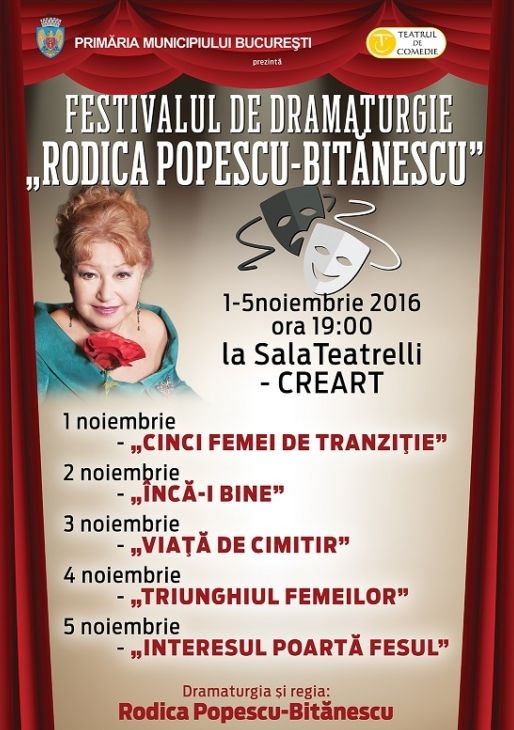 Zilele a avut loc in Bucuresti "Festivalul Rodica Popescu-Bitanescu", o serie de cinci spectacole in cinci zile consecutive, intre 1 si 5 noiembrie, evenimentul fiind organizat cu sprijinul Primariei Bucuresti. Ciprian Ciucu, consilier PNL in cadrul Consiliului General al Municipiului Bucuresti, a reactionat vehement, subliniind intr-un mesaj public ca Bitanescu ar fi recompensata astfel de Firea dupa ce actrita a sustinut-o in campania alegerilor locale.
