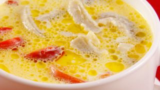 Dupa ce a fiert, zeama se strecoara, iar burta se separa de restul ingredientelor. Burta se taie in fasii. Jumatate din zeama fiarta se pune pe foc, iar cealalta la racit.Pasul urmator este sa pregatiti o galetusa de smantana grasa, spargeti 15 oaua. Trebuie sa separati albusurile de galbenusuri. Amestecati galbenusurile cu smantana. Compozitia se adauga in zeama racita, treptat, apoi se pune la foc mic, in oala care a fiert.