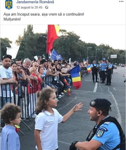 In incercarea de a indemna la pace, Jandarmeria a postat, sambata, o fotografie pe Facebook in care un jandarm discuta cu doi copii. Alaturi de fotografie a fost scris si mesajul: "Asa am inceput seara, asa vrem sa o continuam! Multumim!"