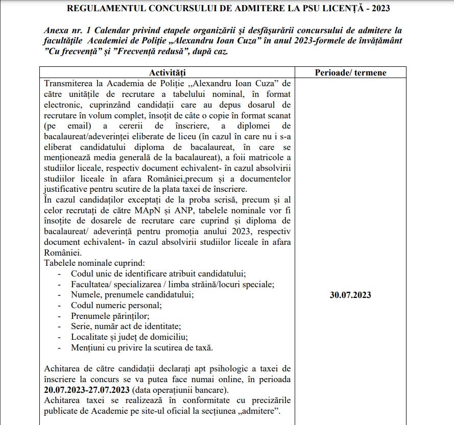 Transmiterea la Academia de Poliție ,,Alexandru Ioan Cuza” de către unitățile de recrutare a tabelului nominal, în format electronic, cuprinzând candidații care au depus dosarul de recrutare în volum complet, însoțit de câte o copie în format scanat (pe email) a cererii de înscriere, a diplomei de bacalaureat/adeverinței eliberate de liceu (în cazul în care nu i s-a eliberat candidatului diploma de bacalaureat, în care se menționează media generală de la bacalaureat), a foii matricole a studiilor liceale, respectiv document echivalent- în cazul absolvirii studiilor liceale în afara României,precum și a documentelor