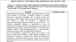 Iată mai jos calendarul privind etapele organizării şi desfăşurării concursului de admitere la facultăţile Academiei de Poliţie ,,Alexandru Ioan Cuza” în anul 2023- formele de învățământ ”Cu frecvență” și ”Frecvență redusă”, potrivit site-ului oficial al instituției.