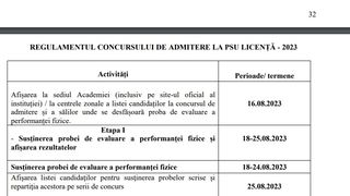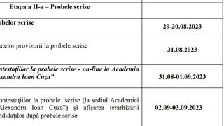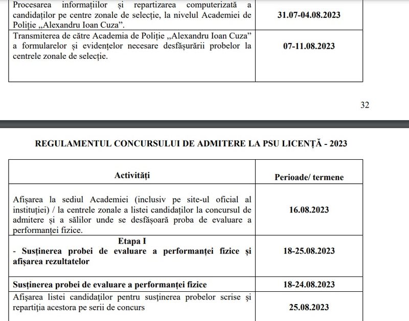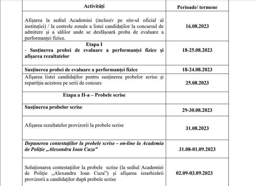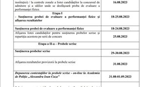 Admitere Academia de Poliţie 2023: Susținerea probei de evaluare a performanței fizice are loc între 18 și 24 august, susținerea probelor scrise se face între 29- 30 august, iar afişarea rezultatelor provizorii la probele scrise are loc pe 31 august.