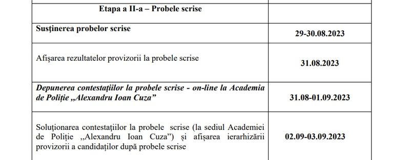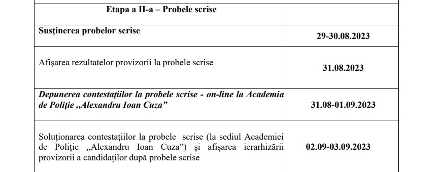 Soluţionarea contestaţiilor la probele scrise (la sediul Academiei de Poliție ,,Alexandru Ioan Cuza”) și afișarea ierarhizării provizorii a candidaților după probele scrise 02.09-03.09.2023