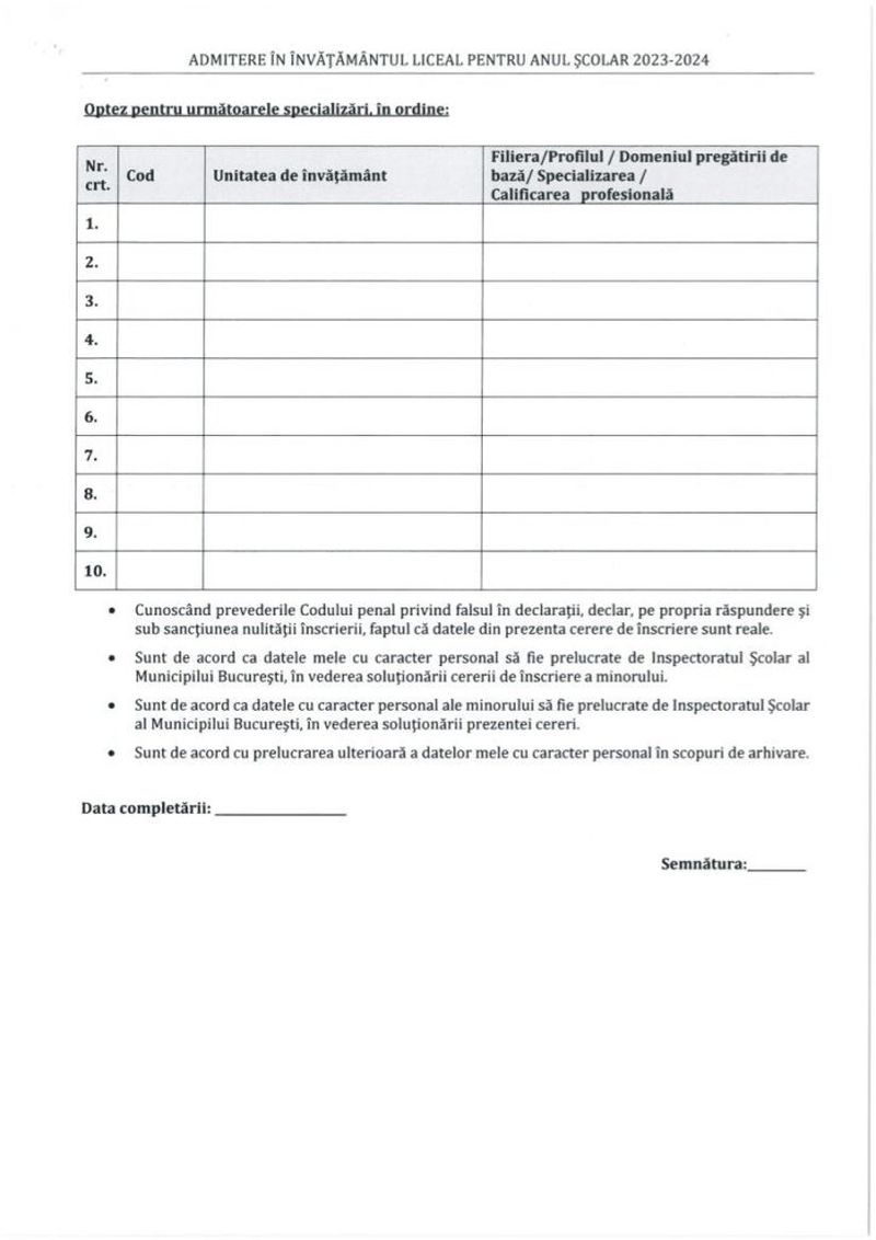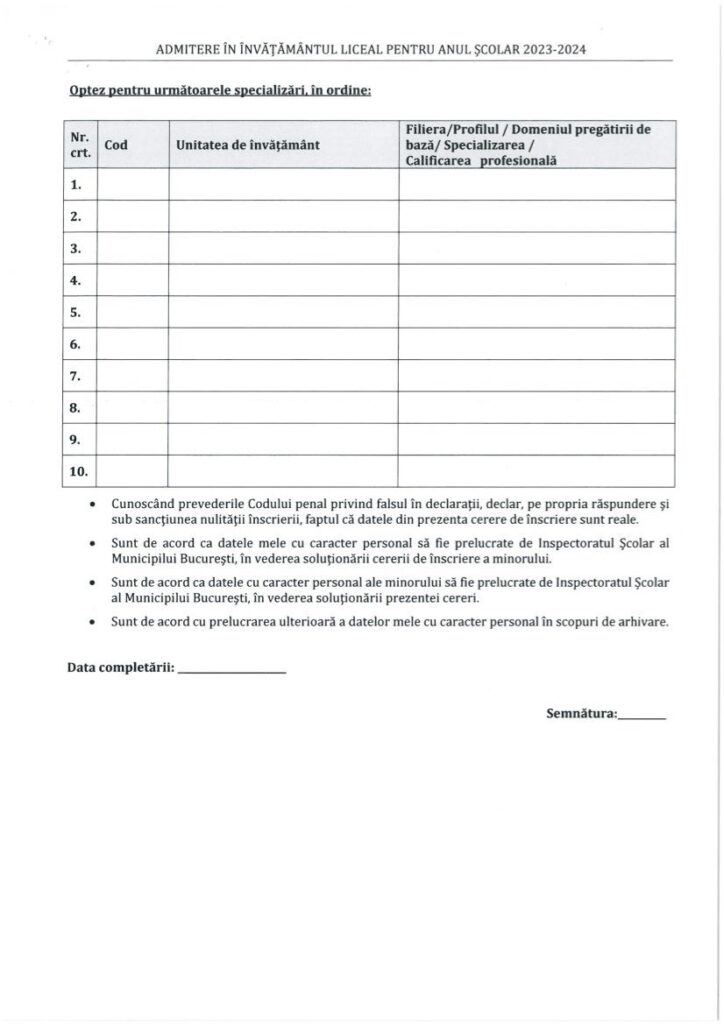 În cererea de înscriere, candidaţii exprimă un număr de maxim 10 opțiuni. Completarea cererii cu codurile liceelor/colegiilor se face respectând Lista cu locurile libere, care vă fi postată de inspectoratele școlare în data de 28 iulie 2023.