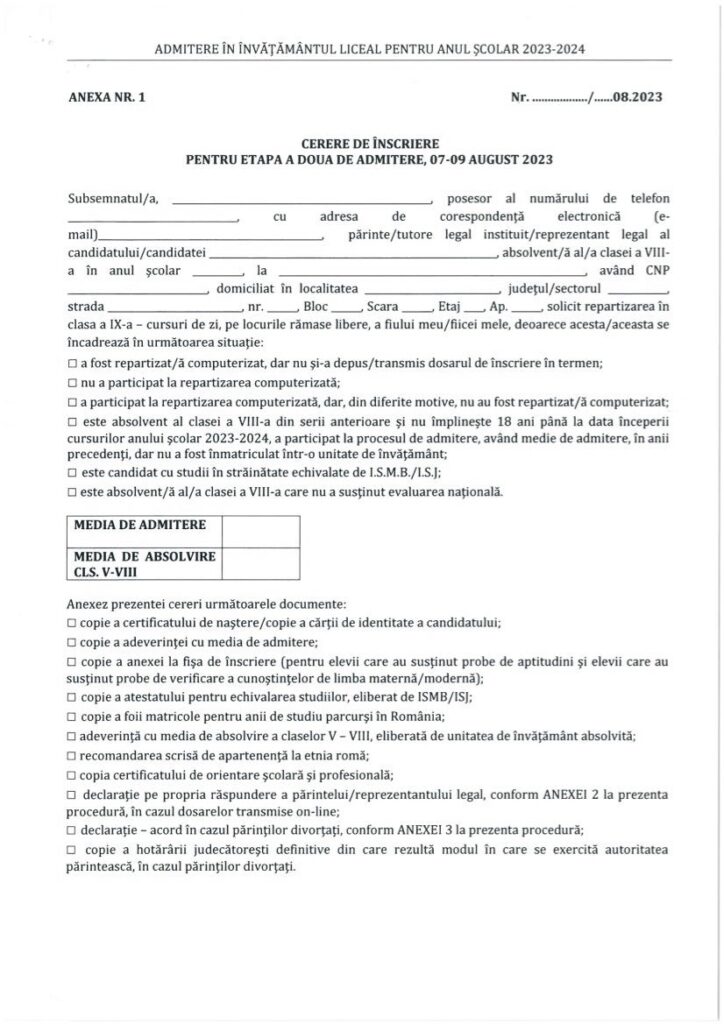 DOCUMENT – Model Cerere înscriere pentru etapa a II-a de admitere la liceu 2023