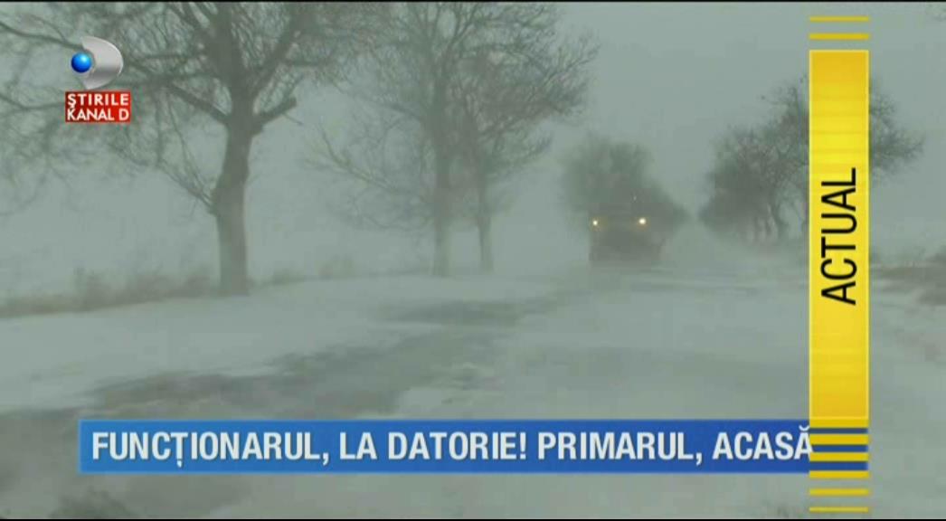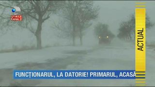 Barbatul lupta cu viscolul, dar si cu somnul, ca de'- rar ne loveste urgia! O comuna mai incolo, un alt functionar gata sa dea alarma e ochi si urechi la vremea de afara!