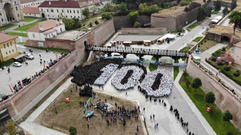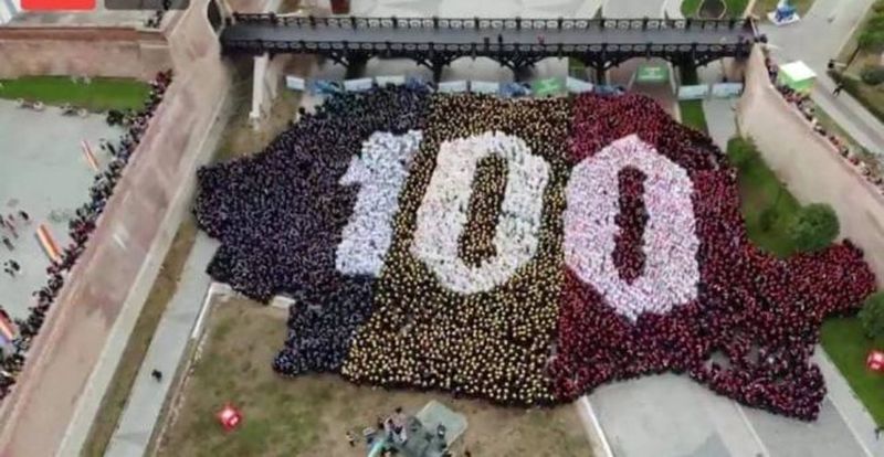 Peste 4.800 de persoane au stabilit sambata, la Alba Iulia, recordul mondial cu cea mai mare harta a unei tari formata din oameni, in interiorul careia a fost format si numarul 100, simbolizand Centenarul Marii Uniri.